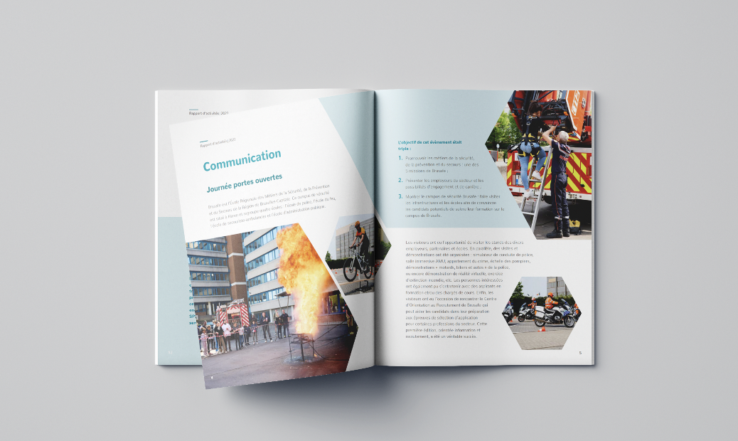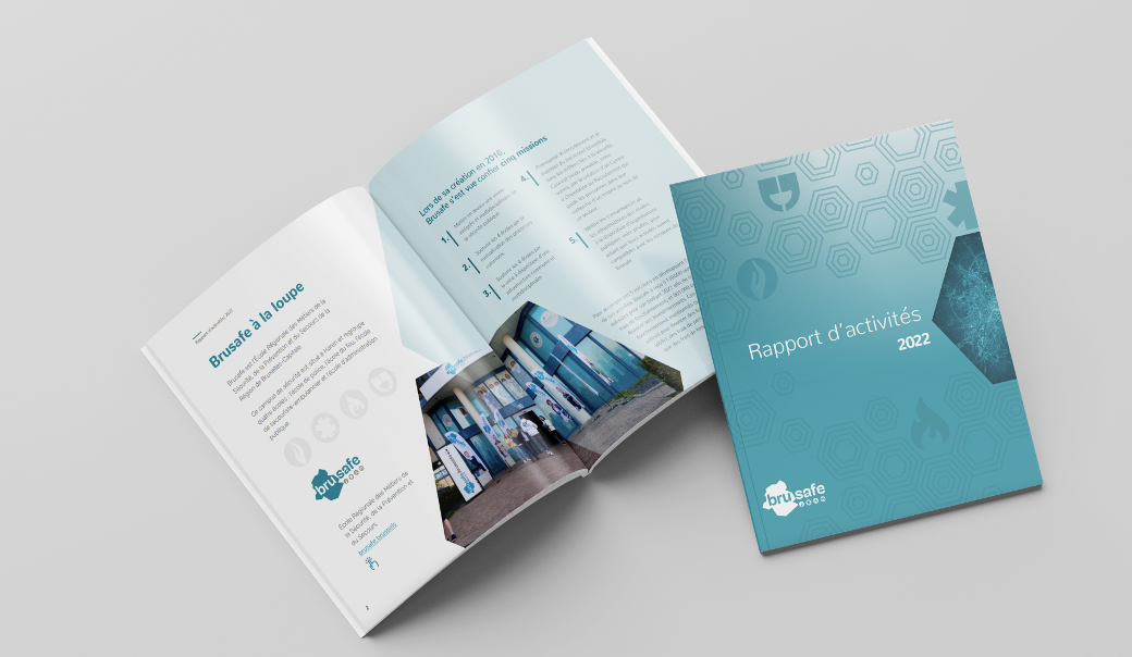 Brusafe is the Regional School for Security, Prevention, and Emergency Professions. Studiorama developed a visual identity based on the graphic charter and handled the layout of the annual reports.
